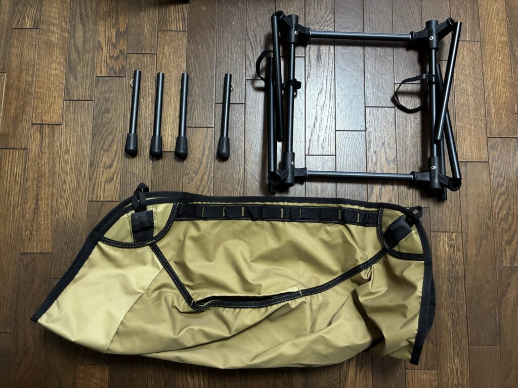 レッグポールを外した状態。地べた・お座敷スタイルに最適で、座面が低くなるため、ゆったりと焚き火を眺めるのに最高の角度になります。