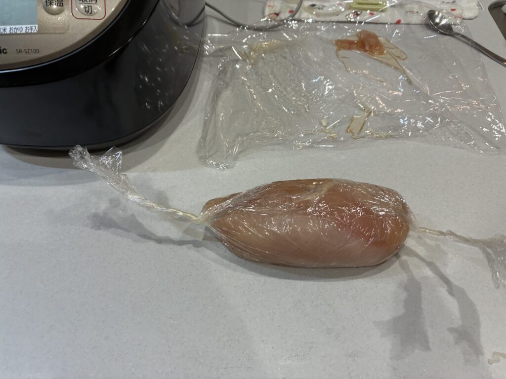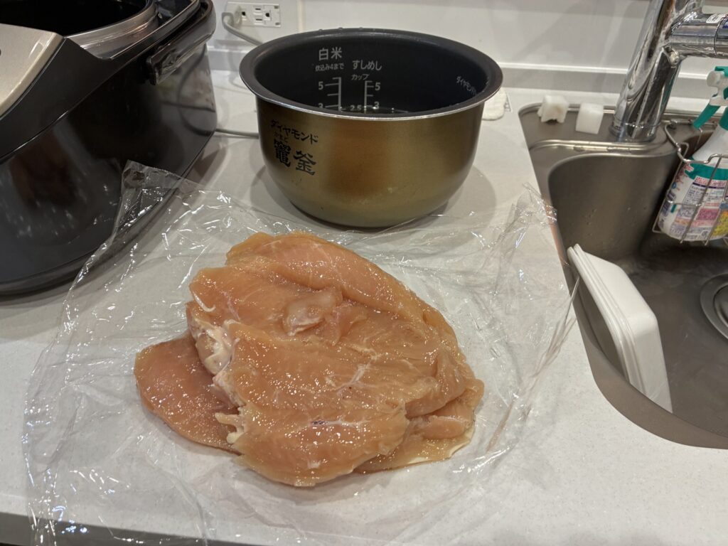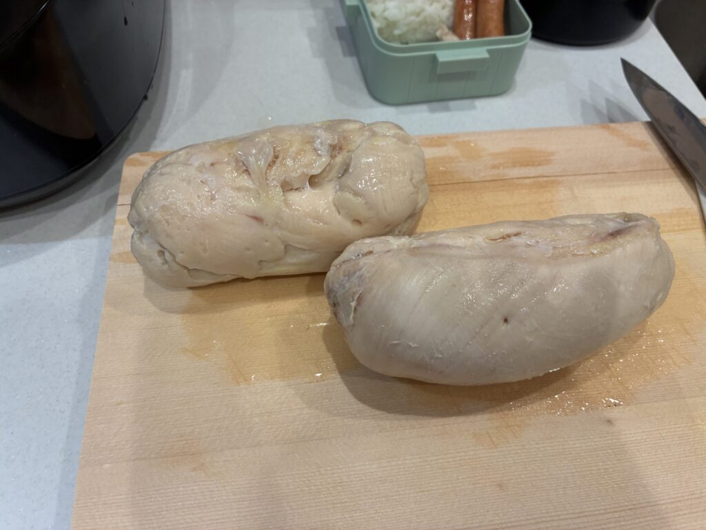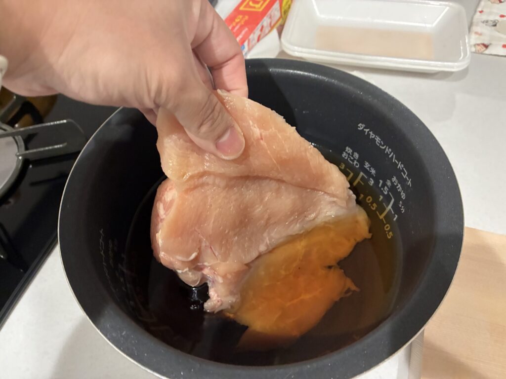 1時間たったら炊飯ジャーから鶏むね肉を引き上げていきます。