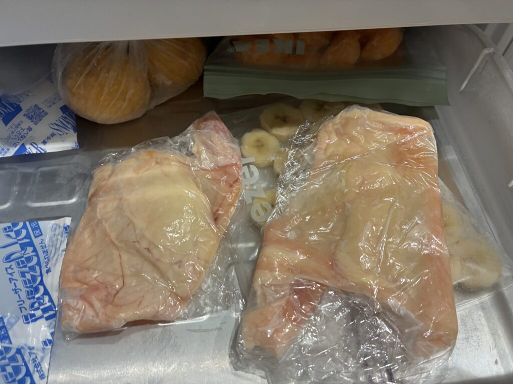 僕は鶏むね肉を2つ(300g×2個)を調理したので、水1000ccに塩、砂糖が50gずつでした!