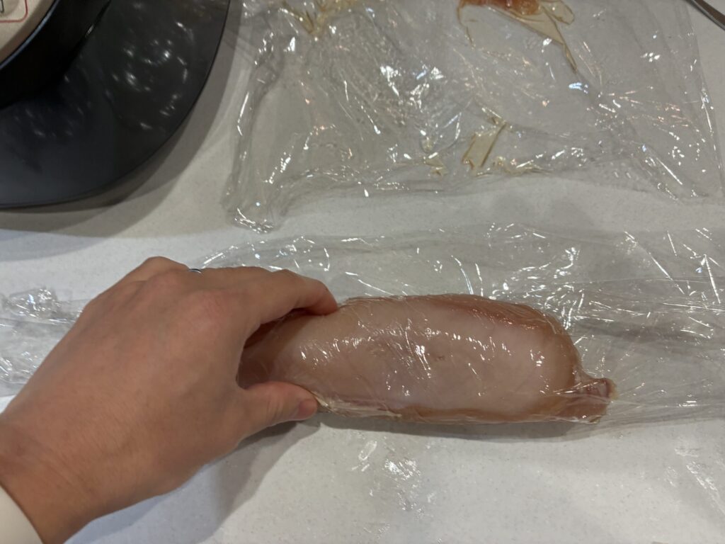しっかりと鶏むね肉がつかるようにしてください。ここまで出来たらサランラップをして冷蔵庫で少し寝かせましょう!
