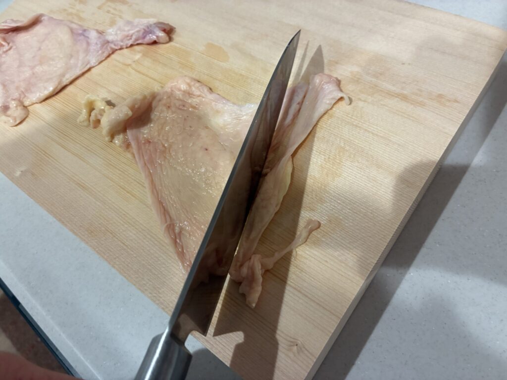 皮を手ではいでから胸肉の真ん中から観音開きするように切っていきます。