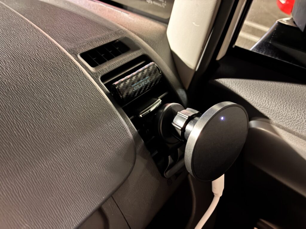 エアコン吹き出し口に取り付けるタイプで、近づけるだけでマグネットがしっかりくっつき、そのまま最大7.5Wのワイヤレス充電ができます。