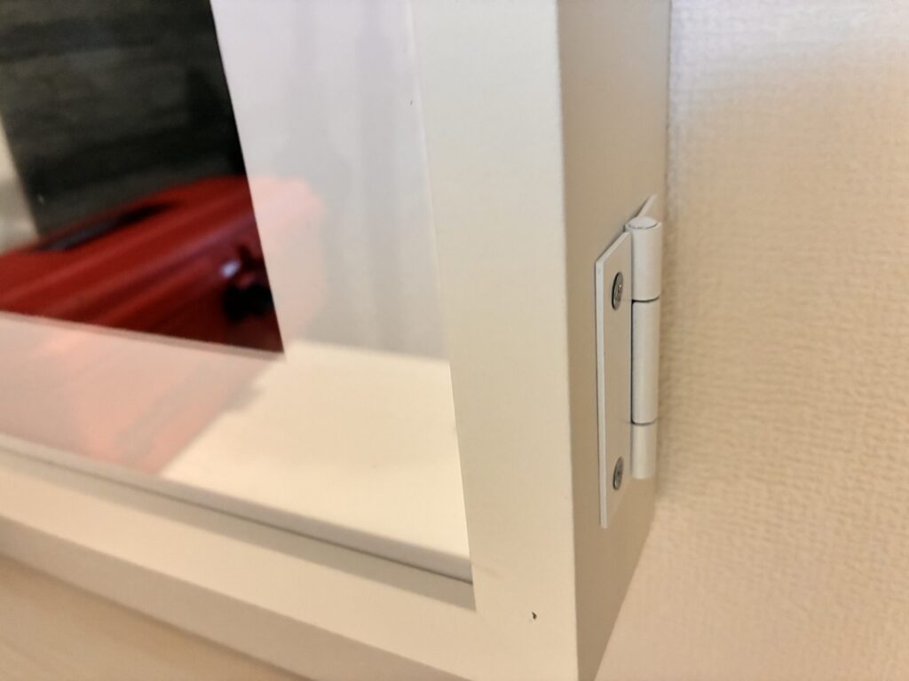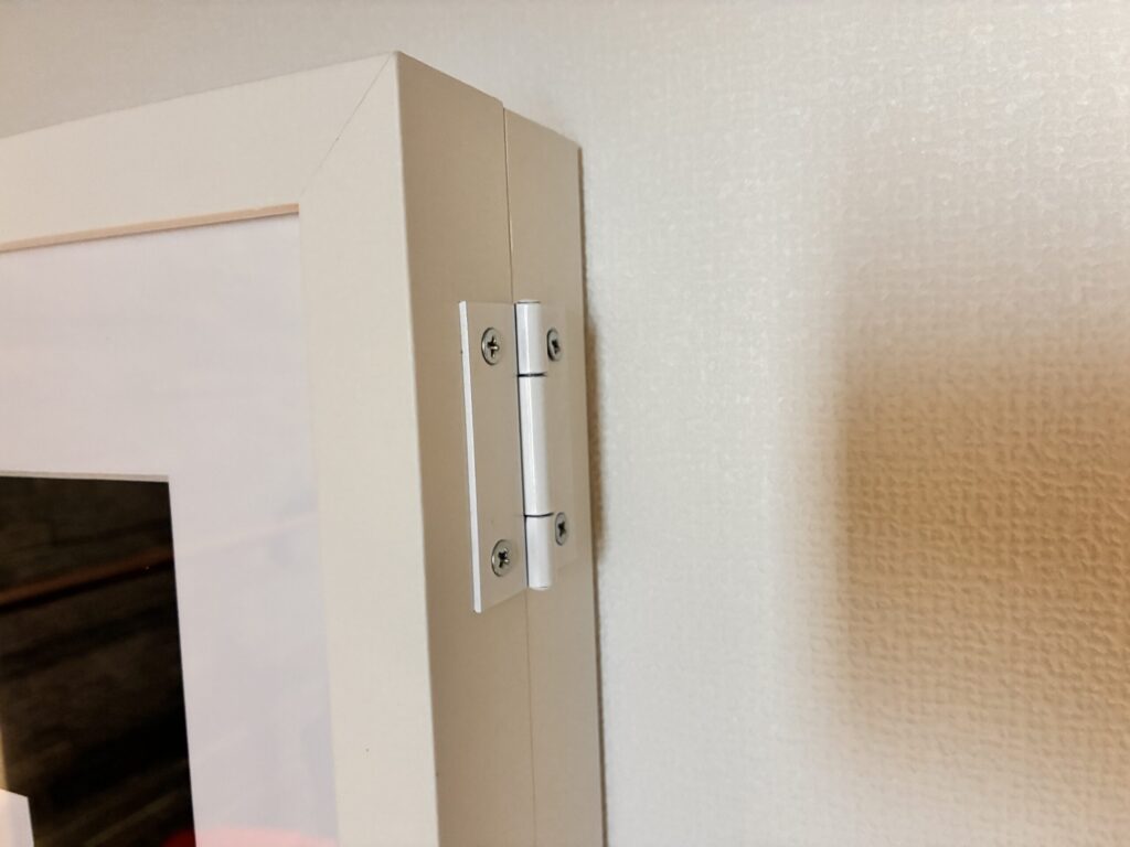 ③ ヒンジで額縁を扉化、外部にL字ステーを取り付け