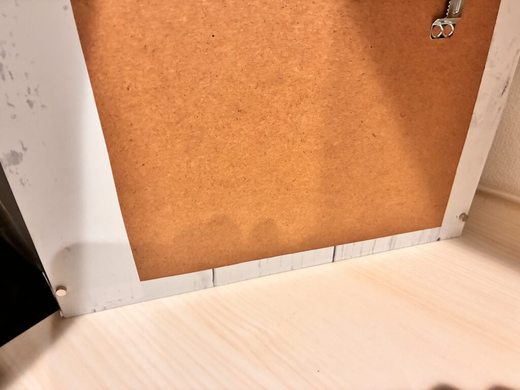 裏側にマグネットを貼り付けて額縁を裏板貼り付ける。接着剤で貼り付けてもいいですが雰囲気を変えたい時、取り外して加工できなくなるので簡単に取れるようにします!