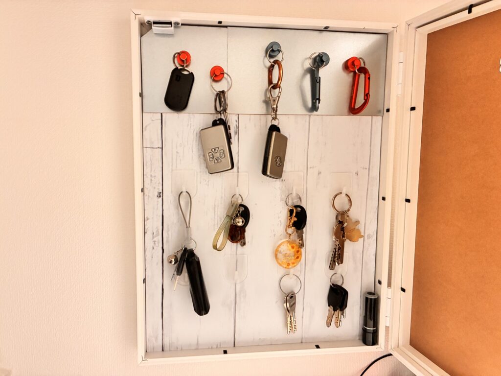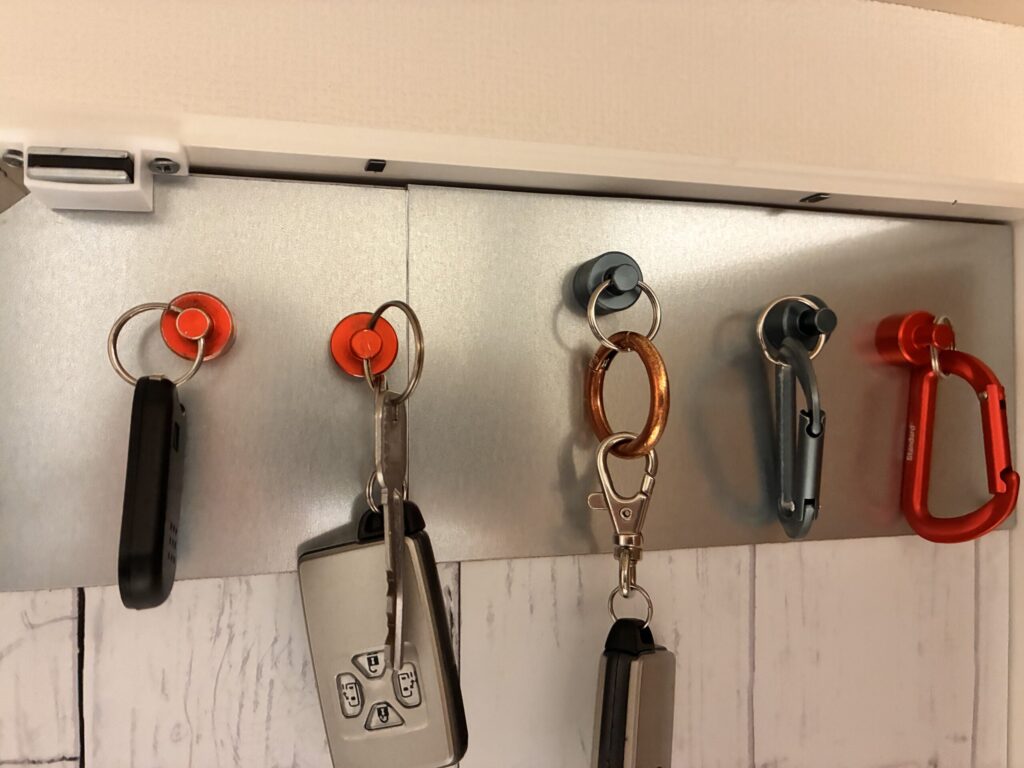 僕が作ったものには上部にステンレス板を貼り付けているので、このようにマグネットが付いている鍵などはピタッと固定できるようにしました。