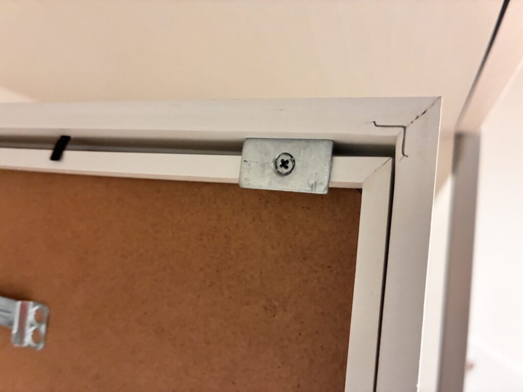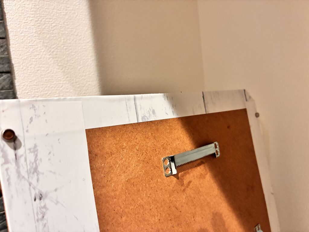 これが地味に難しい!額縁を水平に保ちながら石膏ボードピンを打つ必要があるので、誰かに支えてもらうか、箱などの上に置いた状態で取り付けるのがコツです。