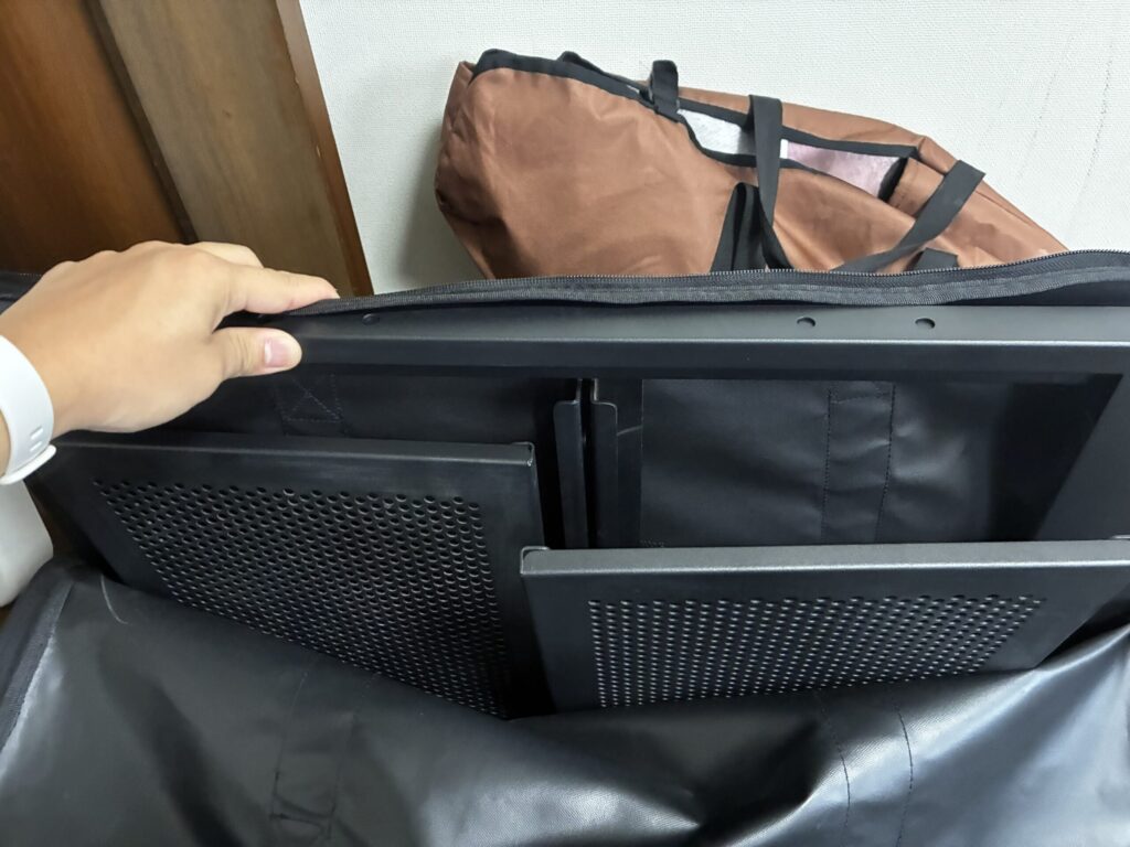 メリットで天板が外れIGT規格の天板と付け替えることができると説明しましたがカチッと固定されてるわけではないので収納時はフレームから外れてしまうことがあります。